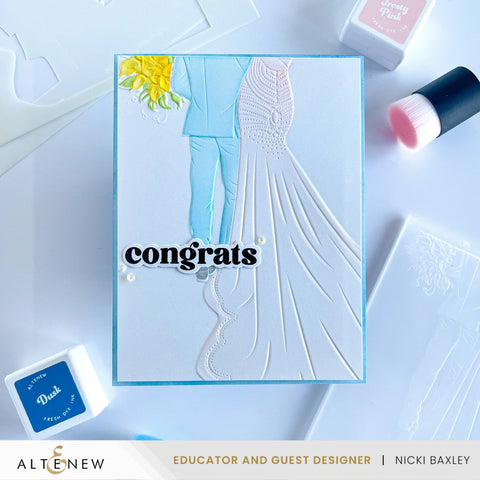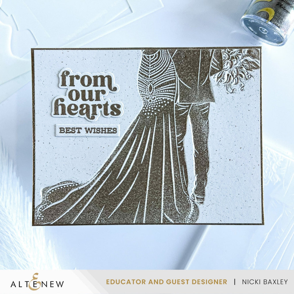 Capture the magic of love with the 6" x 6" Enchanted Beginnings 3D Embossing Folder. It reveals a heartwarming glimpse of a bride and groom holding hands on their special day, adding an elegant touch to your projects. The image covers the front of an A2 card perfectly too!