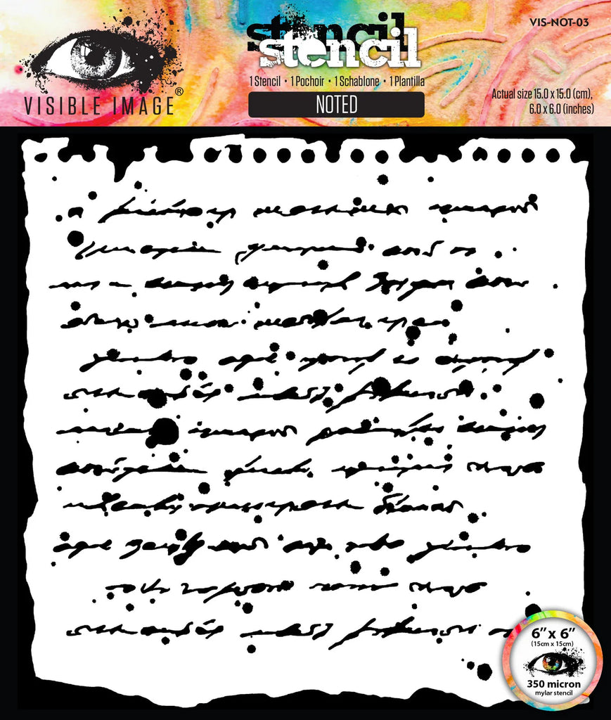 Use it with inks, pastes, paints, or sprays to build grungy, expressive effects in your art journals, cards, tags, and scrapbook pages. The Noted design coordinates seamlessly with other Visible Image stamps and stencils and works beautifully with a wide range of other designs.