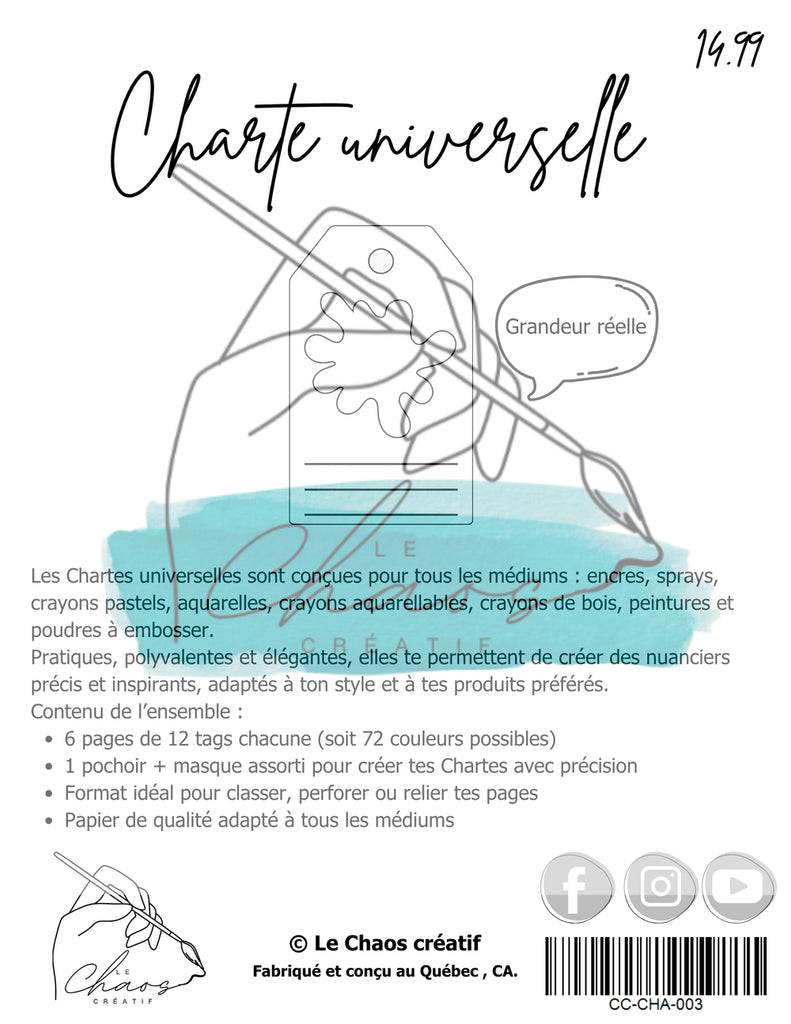 Les Chartes universelles sont conçues pour tous les médiums : encres, sprays, crayons pastels, aquarelles, crayons aquarellables, crayons de bois, peintures et poudres à embosser.