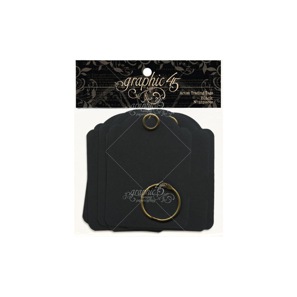 The perfect tags to draw or paint your own beautiful designs onto each surface for presents and more! This package contains Graphic 45-Staples Artist Trading Tags: Black, twelve 3.5x2.5 inch artist trading tags and one metal ring.