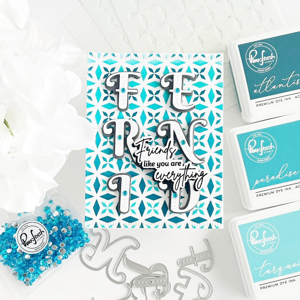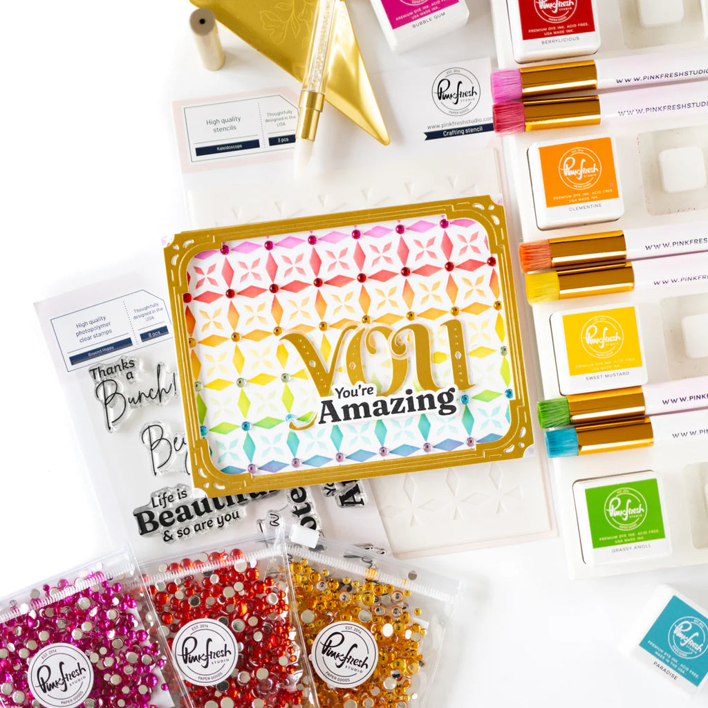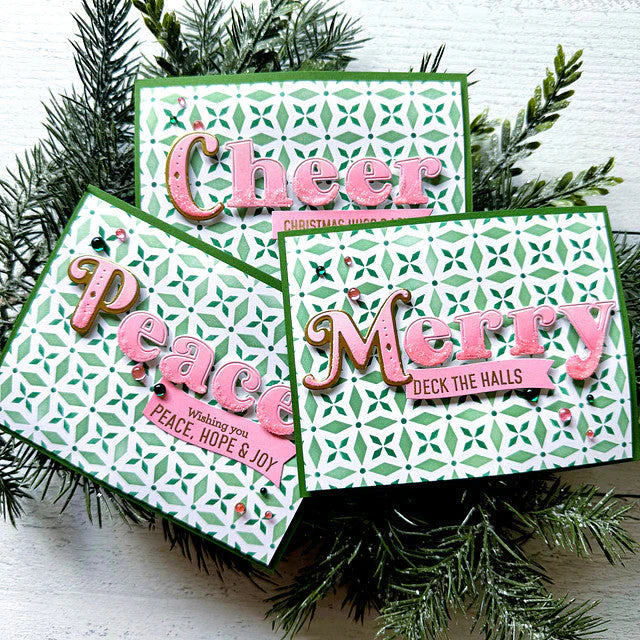 3 piece layering stencil set designed by Kaitlin Sheaffer. Create a fun geometric background by ink blending with our 72 shades of premium dye ink. Add dimension to a layer with texture or glitter paste, or add some shine with embossing ink & powder. The color choices are endless with this fun layering stencil set! There is a separate stencil for each layer, with guidelines on each stencil for perfect alignment.