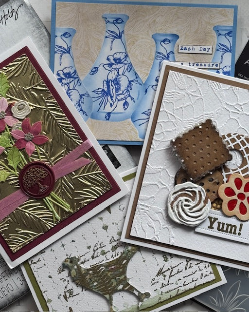 In this technique class, participants will learn embossing and debossing techniques that  will add beautiful details to their projects.  Techniques will include embossing with powders, dry embossing, faux embossing, embossing folders and letterpress style embossing.   This is a technique class, not a project class, but inspiration will be provided for finished projects.