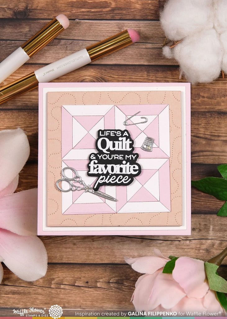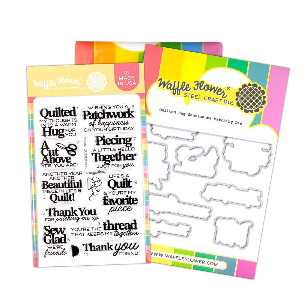 This combo comes in an XL Cloud Storage Pocket and includes both of the following:Quilted Hug Sentiments (stamp)Quilted Hug Sentiments Matching (die)