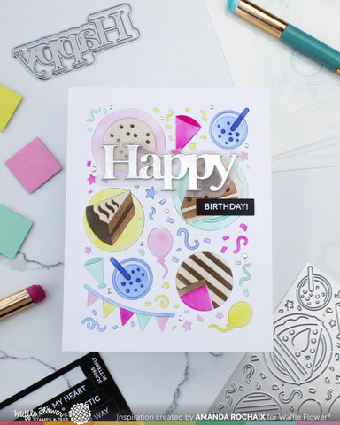 Get the party started with this fun setting of cakes, balloons, confetti, and more! The Cake Time Texture Die adds a cheerful touch to birthday and celebration cards. Use it on its own for a subtle textured look or pair with the cake time stensil or Cake Time sepia-layer stencil to add pops of color to each element. You can also trim out the shapes to create your own festive arrangements.