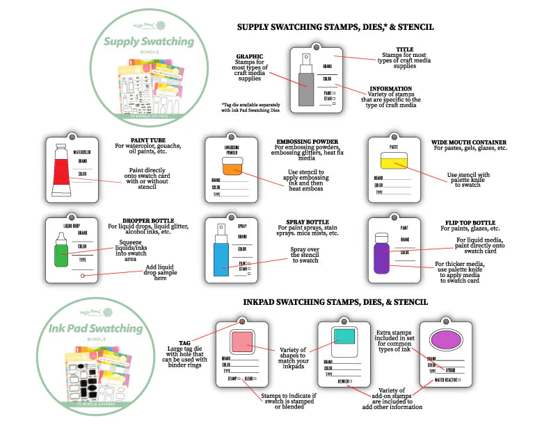 Organizing your crafty stash can almost be as fun as the crafting itself! The Supply Swatching system with Stamp Set, matching die and coloring stencil was designed by crafters for crafters! The system is a game changer for swatching aficionados with a unique visual approach to swatching almost any type of crafting media! The Stamp Set includes a variety of graphic stamps that match the shapes of your favorite media including a tall spray bottle, a flip-top bottle, an embossing powder pot, a wide-mouth paste/gell jar, a paint tube, and a dropper bottle. This set also includes a variety of stamps that let you add information to your swatches such as brand, color, and type. Mix and match the stamps to match your stash!