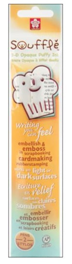 SAKURA-Souffle Opaque Puffy Ink Pens. These fun pens create writing that you can feel! They work on light or dark surfaces and can be used to embellish and emboss scrapbooks, cards, stamped designs, or any other crafty project. Each pen creates a bold 0.7mm line that dries with a delicate fluffy matte effect. This package contains two pens.