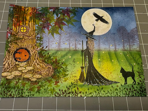- Optional, to reduce waiting time, you may also bring the following items that were used to create the two pages: Elements inks used: Dark Denim, Midnight Blue, Truffle, Russet Orange, Blue Lagoon, Blue Atoll, Pine, Olive, Pixie Green, Soft Cygnet, Della Blue, Mulberry, Pink Elephant, Greensleeves. Versafine inks used: Fallen Leaves, Nocturne, Golden Meadow, Shady Lane, Acorn, Portobello, Tulip Red, Chianti. Re-inkers used: Russet Orange, Emperor Red, Paprika, Sahara, Soft Cygnet; Mica Minerals used: Iridescent Blue, Iridescent Violet; Lavinia stamps used: LAV798 Bijou, LAV800 Gus, LAV822 Burst of Stars, LAV811 Vine Branch, LAV572 Druid's Inn, LAV916 Marcie, LAV909 Hocus & Pocus, LAV1005 Ravens, LAV165 Vine, LAV039 Maple Leaf, LAV290 Mini Maple, LAV052 Trees, LAV197 Field Grass; Stickles used: Mountain Lake, Aubergine, Cosmic, Copper, Black Diamond, Graphite, Confetti, Champagne, Posca markers used: Apple Green, Orange Glitter, Yellow Glitter Other materials: Inktense watercolor pencils or others, Moon Mask (Tim Holtz and Lavinia), Versamark stamp pad or equivalent, Clear Shimmer pen (Prism or Wink of Stella or similar), Pan Pastel White Fine Pearl medium with application tool, metallic gel pens: black, orange, blue, violet.