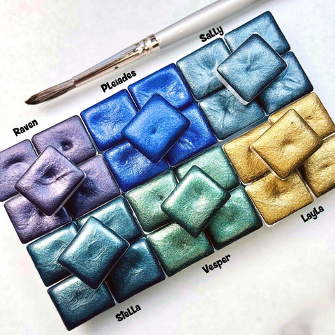 Les pigments de cette collection sont hyper fins, soyeux et se prêteront aussi bien à la calligraphie à la plume qu’à la peinture. Prendre note que leur nature les rend plus sensibles à la lumière, une bonne protection est donc recommandée (vernis ou encadrement anti-UV).