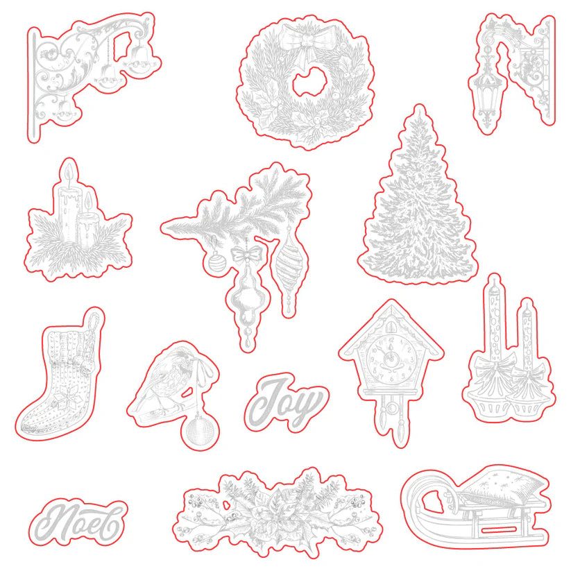 Transform your holiday designs with this 16-piece steel die set from the Gallery Wall: Holiday collection! These precision-cut dies pair perfectly with the coordinating stamp set (sold separately) and come pre-clipped for instant crafting convenience. Crafted from premium 100% finished steel, they work seamlessly with virtually all standard die-cutting machines. Let your imagination run wild with these vintage images.
