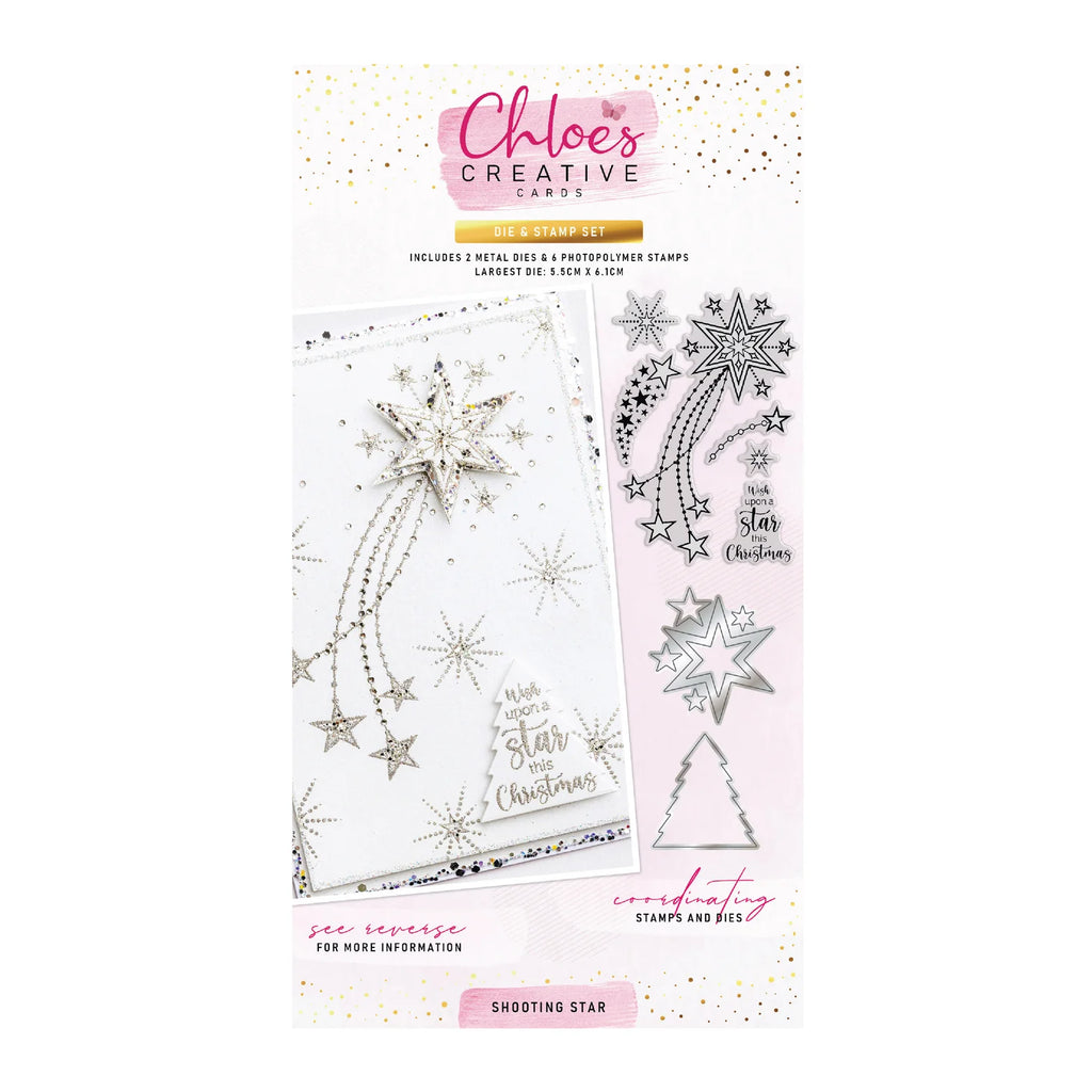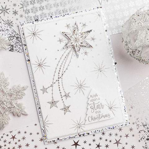 Wish upon a star this Christmas with this dazzling celestial set! Combine outline and detail dies with the coordinating stamps for a magical effect. This Shooting Star die and stamp set contains two metal dies and six photopolymer stamps (largest die size 5.5x6.1cm).