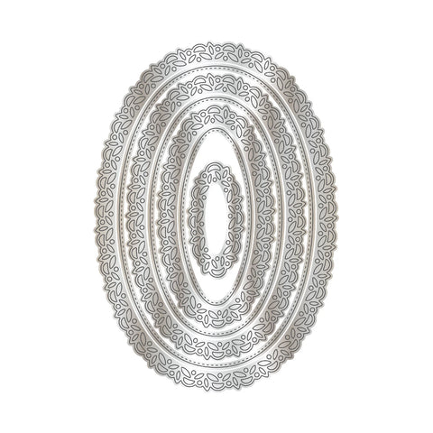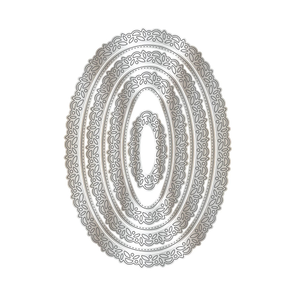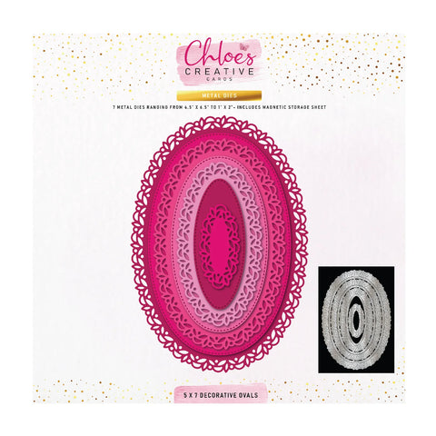 This Metal Die Set—5x7 Decorative Oval contains seven metal dies, ranging in size from 1x2” to 4.5x6.5”. You will also receive a magnetic storage sheet to fit all seven nesting dies.