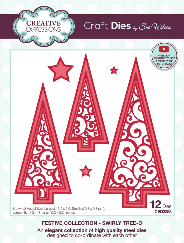 The Swirly Tree-O craft die is a great addition to Sue's Festive Collection. This gorgeous contemporary design is perfect for all your Christmas cards & projects. The high quality steel dies are compatible with most home die cutting machines and will work with the other dies in the collection or on their own. Made In China. 12 dies. Largest die 12.9 cm x 6.0 cm (5.1 ins x 2.4 ins).
