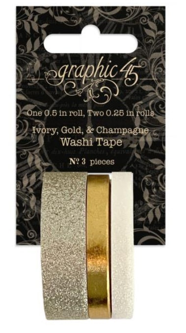 Includes one 1/2 roll of Champagne Glitter Washi, one 1/4 roll of Ivory Glitter Washi, and one 1/4 roll of Gold Gloss Washi. 12 yards total. Perfect for embellishing cards, layouts, mini albums, and all your favorite Graphic 45 projects!