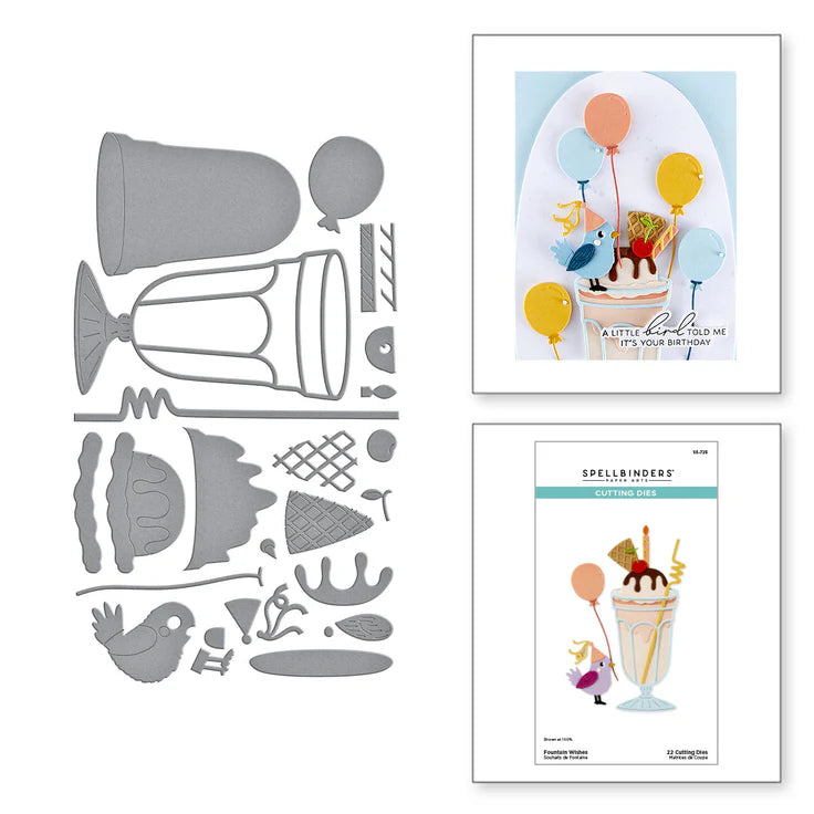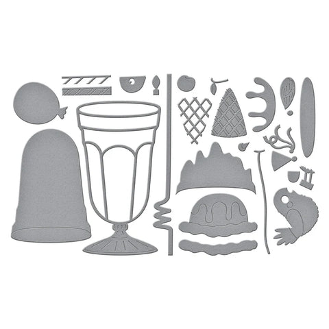 Fountain Wishes Etched Dies are from the Happier Hour Collection. When assembled, this set of 22 thin metal cutting dies creates sweet drinks based on a tall, footed fountain glass. Details include an ice cream scoop and drips to make it real!